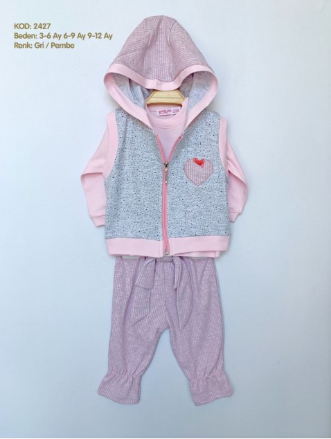 KUM DESEN YELEKLİ 3'LÜ TAKIM 2427-PEMBE